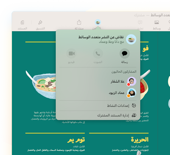 تعاون وشارك بكل سهولة الملفات والمجلدات والمستندات والمزيد أثناء تنقلك. ما عليك سوى إرسال رابط خاص وتحديد إذا ما كان بإمكان الآخرين عرض المشروع ومشاركته والتعديل عليه. وبفضل التحديثات المباشرة، يمكنك رؤية التعديلات عند إجرائها مباشرة.