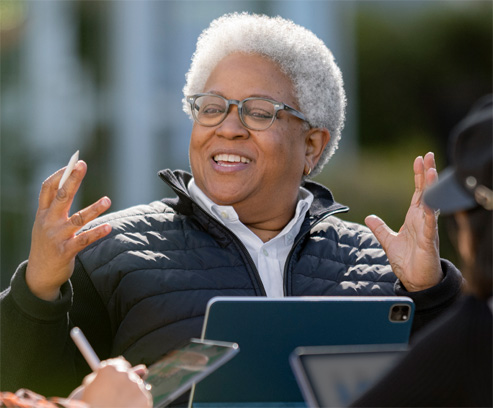 A tecnologia Apple transforma a sala de aula em um espaço dinâmico de ideias. A Dra. Gopalakrishnan utiliza recursos integrados de acessibilidade do iPad Pro, como Ditado e AssistiveTouch, para interagir e ilustrar conteúdo em tempo real. Já o Apple Pencil é uma ferramenta interativa completa para rascunhar, desenhar e fazer marcações.