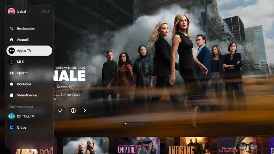 Améliorer les dialogues donne la priorité aux voix dans vos films et émissions, que vous les écoutiez sur les haut-parleurs intégrés de votre télé, un HomePod ou un récepteur audio13. Ainsi, les plus doux murmures ressortent au milieu de la musique et des bruits de fond, pour une expérience sonore encore plus immersive. Et pour qu’aucun mot ne vous échappe, des sous-titres s’affichent juste au bon moment, automatiquement14.