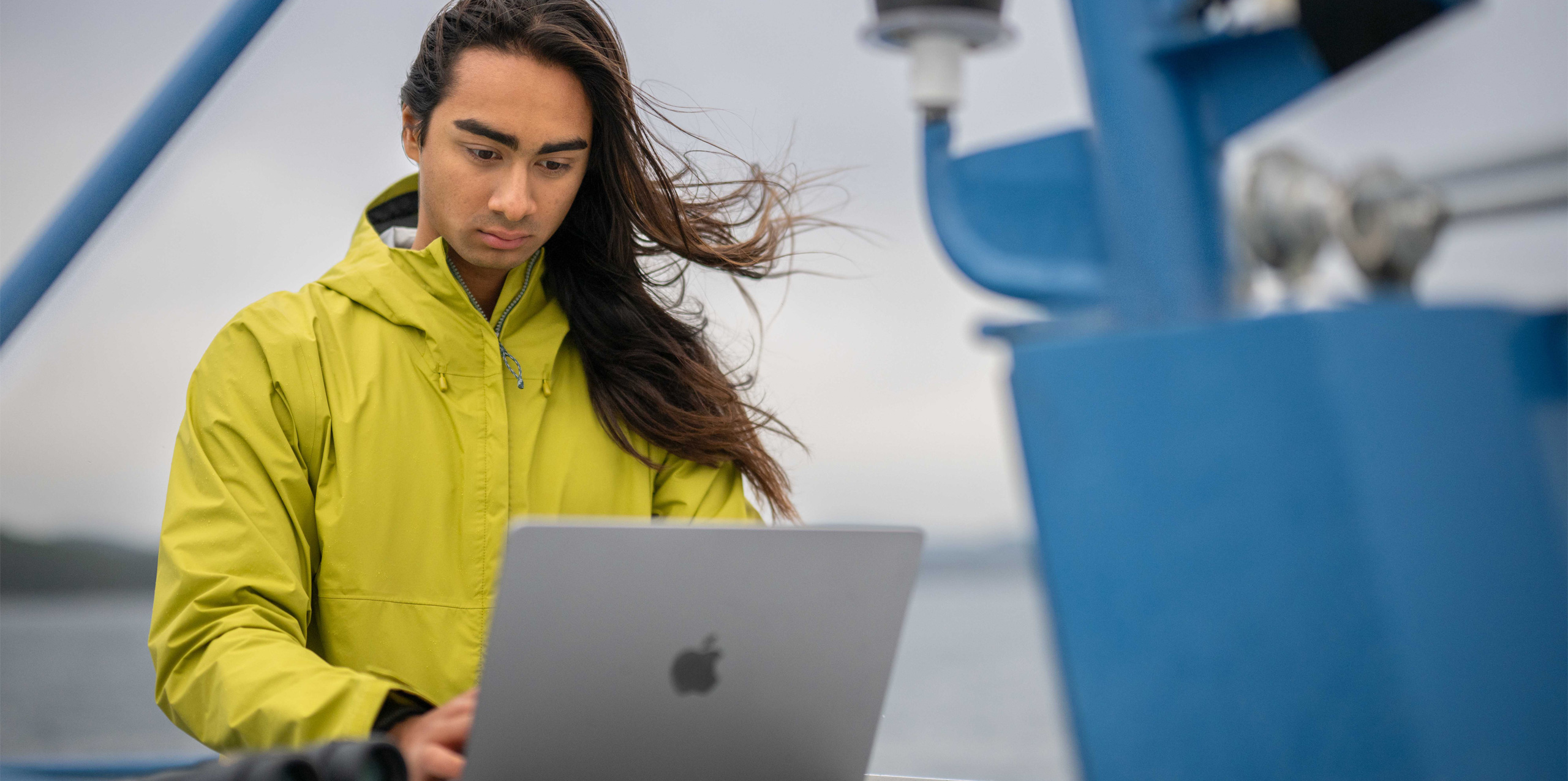 Die Technologie von Apple unter­stützt Bodhi auch bei seiner Forschung an der Uni und der Auswertung von Ergebnissen – zum Beispiel bei der Veran­schau­lichung der Auswirkungen des Schiffs­verkehrs auf die bedrohte Population der südlichen ortstreuen Schwertwale in der Salish Sea. Mit seinem MacBook Air, seinem iPhone und einem Fernglas macht er sich auf dem Wasser an die Feldarbeit für das Projekt. Er proto­kolliert Wal­sichtungen, indem er mit Numbers und Keynote Fluss­diagramme und Übersichts­karten erstellt, aus denen hervorgeht, wo sich die Orte der Sichtungen und beliebte Fähr­routen kreuzen. So hilft er, potenzielle Störungen für die Populationen der heimischen Wale zu identi­fizieren. Und mit dem iPhone macht er beein­druckende Fotos und Videos, die seine Entdeckungen dokumentieren.