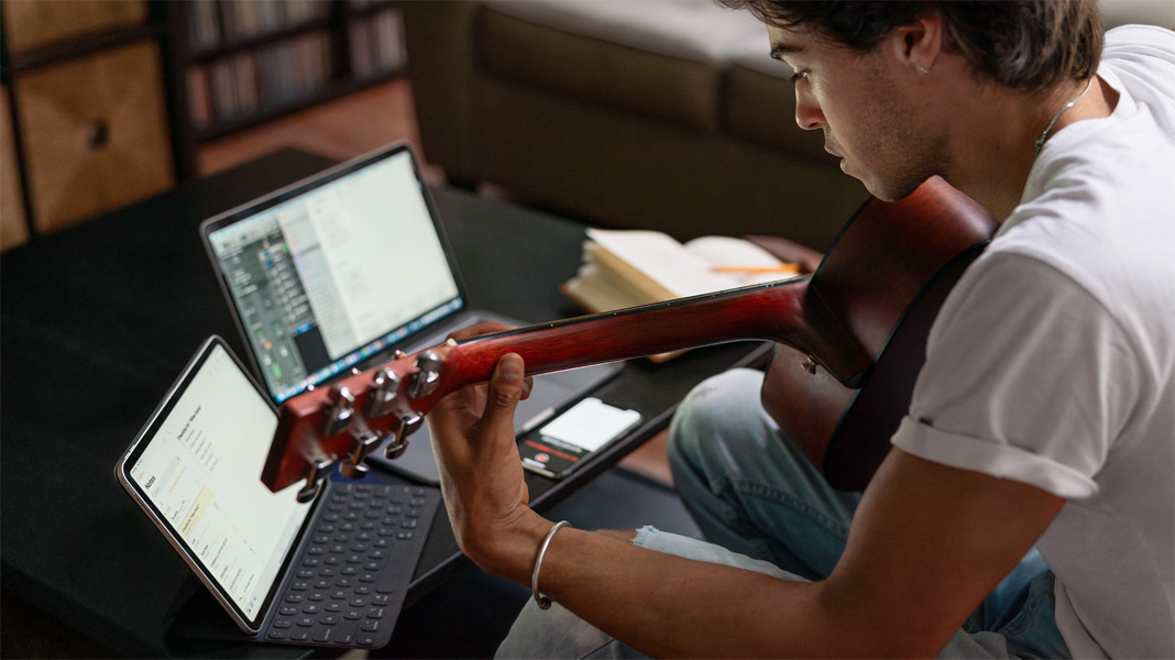 Kuten monet opiskelijat, Max on joutunut sopeutumaan etäopiskeluun, ja siksi MacBook Pro on entistäkin tärkeämmässä asemassa. MacBook Pron ammattimaiset musiikinteko-ohjelmat, kuten Logic Pro, auttavat esimerkiksi tekemään äänitysstudion vaikka makuuhuoneesta.