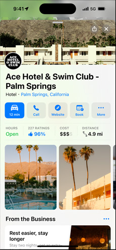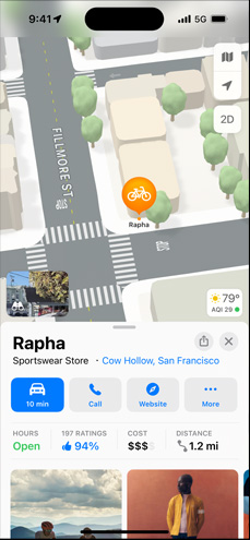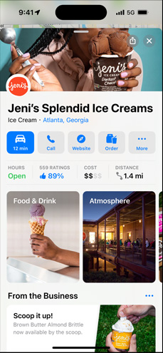 Grazie a Apple Business Connect, trovare la tua attività con Mappe di Apple è semplicissimo. E sei tu a decidere come presentarla. Crea una scheda con indicazioni stradali, informazioni di contatto e azioni integrate: potranno accedervi tutte le persone che usano i dispositivi Apple e le app incluse, in qualsiasi parte del mondo.