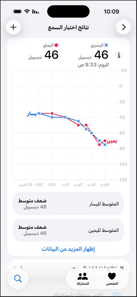خصوصية. أمان. سهولة. تُخزّن كل بيانات اختبار السمع بخصوصية وأمان داخل تطبيق صحتي في جهازك. ويمكنك إعادة إجراء الاختبار في أي وقت تريد، ومراقبة سمعك مع مرور الوقت، وتنزيل نتائج الاختبار، وقراءة مقالات مفيدة عن صحة السمع.