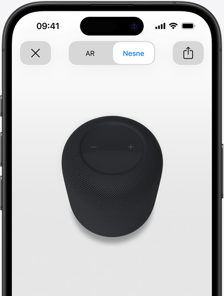 Sayfanın sağ tarafından gelen bir el, bir HomePod hoparlörün üstünde bir iPhone’u tutuyor