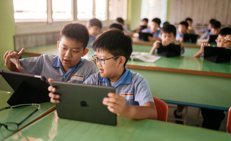 市立志清國小位於台北市商業區外圍,這所公立學校從幼稚園到六年級,共有 700 多名學生。學校由校長張瑞庭帶領,他相信科技可以提升學生的批判性思考能力和創造力,而以 iPad 輔助學習也能幫助孩子面對全球競爭。